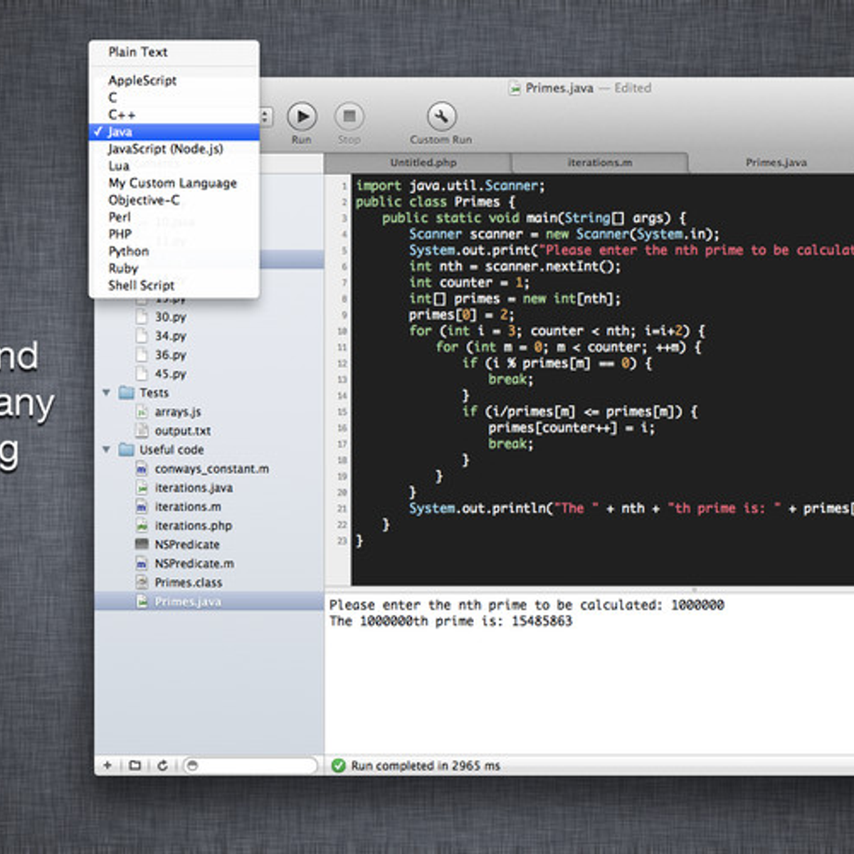 CodeRunner can run code in 20 languages out-of-the-box, and can be easily extended to run code in any other language. Adding a language is as easy as entering its terminal command. CodeRunner can even run multiple-file projects with no additional set-up required. CodeRunner supports full-blown IDE-level code completion for many languages, that includes fuzzy-search, tab-selectable placeholders, and documentation snippets.